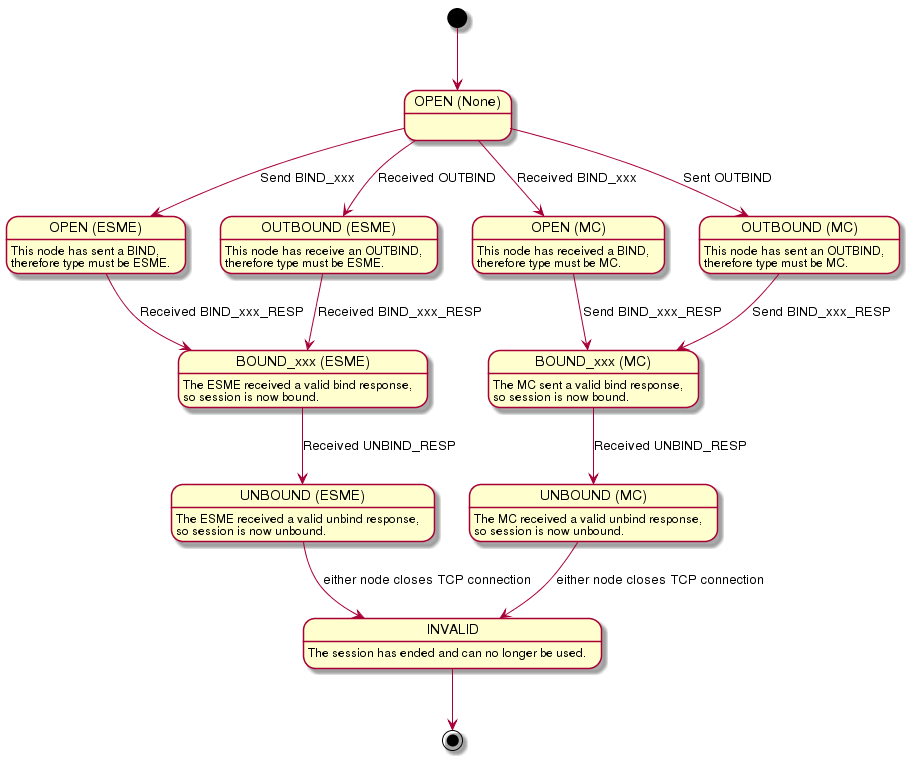 The state diagram shows the states and transitions that an SMPP Session can go through.