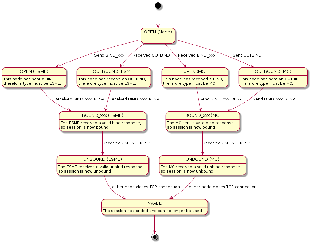 The state diagram shows the states and transitions that an SMPP Session can go through.